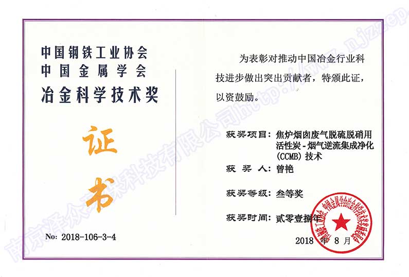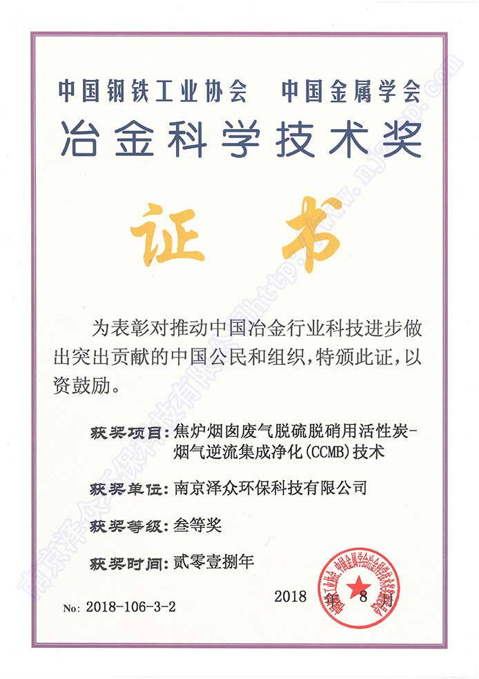 南京澤眾環保科技有限公司坐落于南京市雨花臺區,注冊資本6000萬元,2017年被認定為高新技術企業,2018年被認定為瞪羚企業,入選中國鋼鐵技術與服務供應商品牌企業,被評為鋼鐵產業鏈綠色標桿企業,與浙江工業大學合作成立聯合研發中心,入股河南安鋼澤眾冶金設計有限責任公司,牽頭起草《燒結煙氣活性焦干法脫硫、脫硝技術規范》和《焦爐煙氣聯合脫硫脫硝技術規范》。